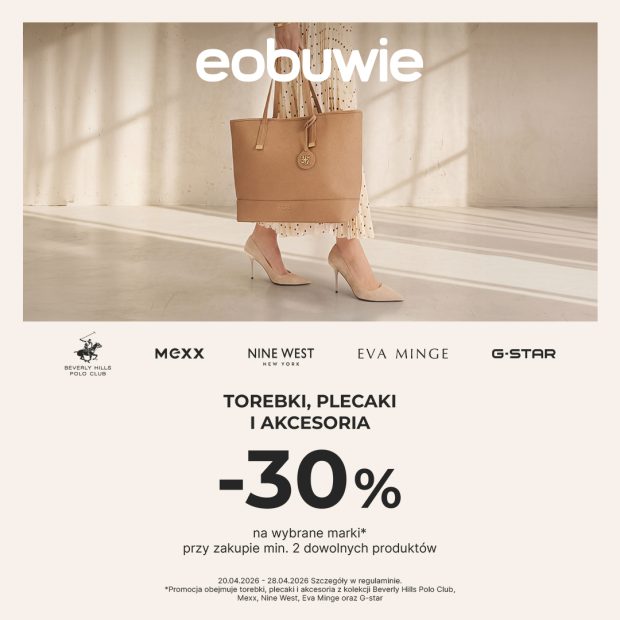 *Promocja obowiązuje w dniach 20.04.2026 – 28.04.2026 i obejmuje torebki, plecaki i akcesoria z kolekcji marek Beverly Hills Polo Club, Mexx, Nine West, Eva Minge, G-Star. Szczegóły w regulaminie.