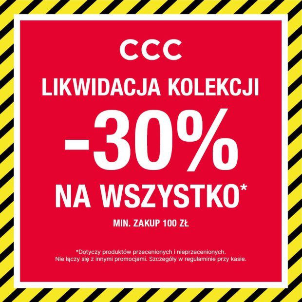 LIKWIDACJA w CCC! -30% na WSZYSTKO przy zakupach za minimum 100zł! Tak na WSZYSTKO. Buty, torebki i akcesoria znanych marek kupisz teraz 30% taniej! Kup, zanim najlepsze modele znikną! Promocja obowiązuje w salonach CCC. Szczegóły w regulaminie